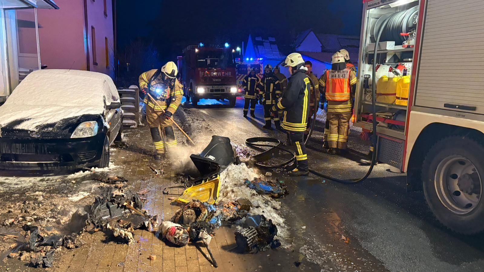 In Sachsenhausen haben am späten Sonntagabend vier Mülltonnen vor einem Wohnhaus in der Gartenstraße gebrannt. Polizei und Feuerwehr gegen 23.16 Uhr alarmiert, nachdem ein Hausbewohner einen lauten Knall gehört und anschließend die Flammen bemerkt hatte. Die Mülltonnen standen neben der Treppe zur Hauseingangstür. Die Feuerwehren aus Sachsenhausen und Höringhausen konnten den Brand schnell löschen und ein Übergreifen auf das Gebäude verhindern. Mehrere Mülltonnen waren beim Eintreffen der Einsatzkräfte bereits großteilig abgebrannt, die Hausfassade war durch Ruß sichtbar beschädigt. Zudem wurden die Brandreste unter Atemschutz auseinandergezogen, um verbliebene Glutnester abzulöschen. Erschwert wurde der Einsatz durch Minustemperaturen und glatte Wege. Die Einsatzstelle wurde ausgeleuchtet und mit Streusalz gesichert. Die Höhe des Sachschadens ist derzeit noch unklar. Die Polizei schließt nicht aus, dass Feuerwerkskörper den Brand ausgelöst haben, und hat die Ermittlungen aufgenommen. Zeugen werden gebeten, sich unter der Telefonnummer 05621/70900 zu melden.